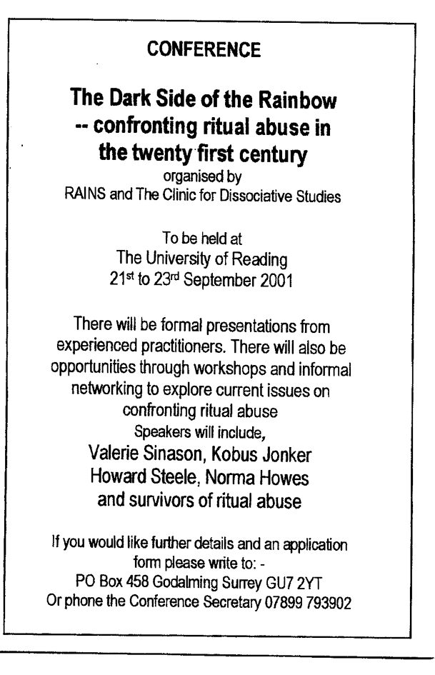 The advertisement shown above for RAINS' 2001 Satan Seminar has not been declared to the public . If the SAFF had not exposed it the British Public would have known nothing about it. But has been specifically advertised to the police and other influential groups. It first appeared in The Police Federation Journal for May 2001. This is not an advertisement for a public conference. If last time is anything to go by you won't get a ticket unless you are already a RAINS member, already a believer or are sitting on the fence and expected to be made a believer soon. Applications may be picked over and rejected without giving a reason. Most journalists were refused admittance. For all the world it appears that RAINs are simply marshalling an army of influential key personnel to drive through their Satanic Abuse theories. Does that sound like a conference trying to get to the TRUTH of the allegations to you? Or does it sound like a fifth column intent on selling an agenda which the public do not really want?